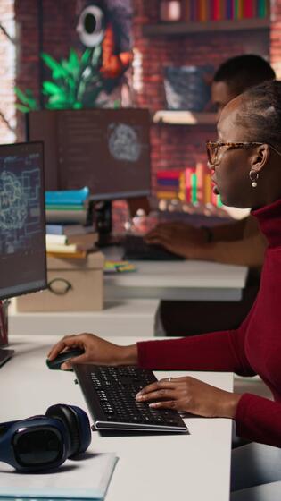 Vertical Programmer coding artificial intelligence algorithm in startup, refining machine learning models to enhance automation and data driven decision making. Woman using coding platform in office, camera A Pro Video