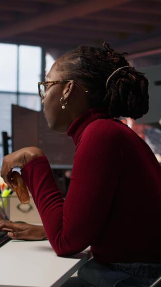 Vertical AI startup engineer eating snack while waiting code to finish compiling, annoyed by long wait. Irked software development agency employee consuming food, exasperated by sluggish PC, camera A Pro Video