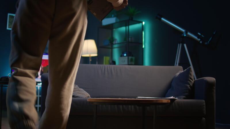Ambitious black man learning a new language alone in his cozy living room, browsing internet for study platforms and explanations. Adult using language learning software online on laptop. Camera B. Pro Video