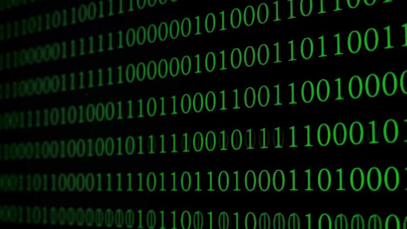 The digital background showcases a pattern of cascading binary code in bright green against a dark backdrop, emphasizing a modern technological theme. Pro Video