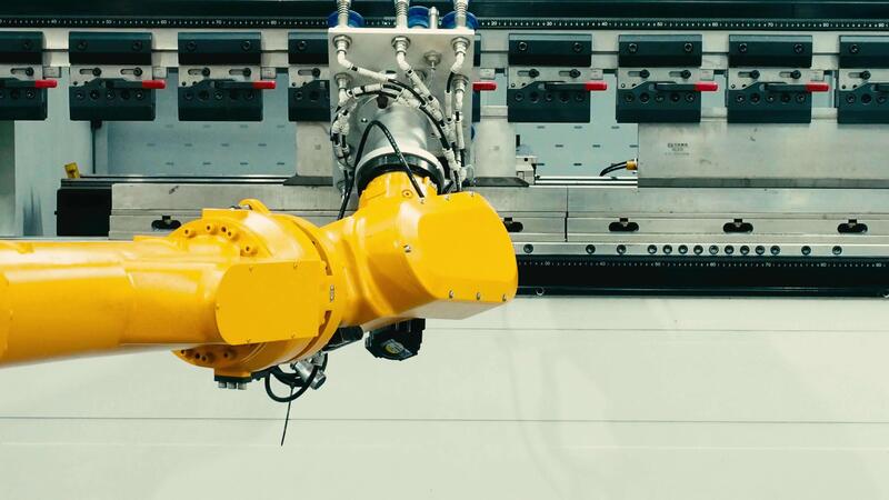 yellow robotic arm with vacuum suction cups operates in front of a press brake machine showcasing automation in metal bending processes. Advanced automate manufacturing precision technology Pro Video