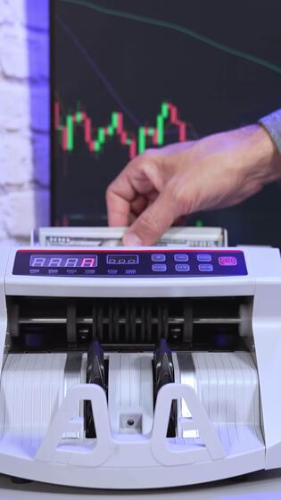 Modern counter machine on large monitor background. Man's hand putting paper money into a counting machine and takes them after financial operation. Vertical Pro Video