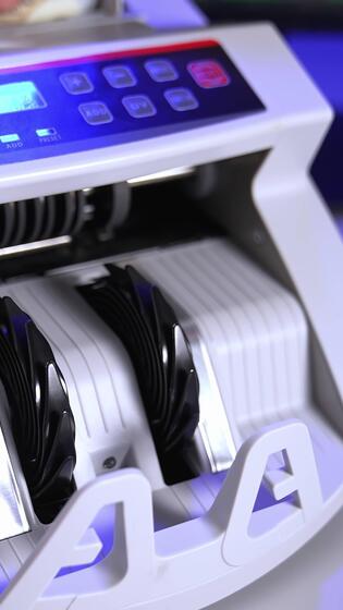 Modern electronic machine. Machine counter automatically calculates a large amount of dollar banknotes. Top view. Business accounting. Vertical Pro Video