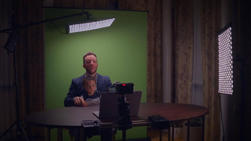 Interview Setup Featuring a Green Screen and Engaging FatherChild Interaction Dynamics Pro Video
