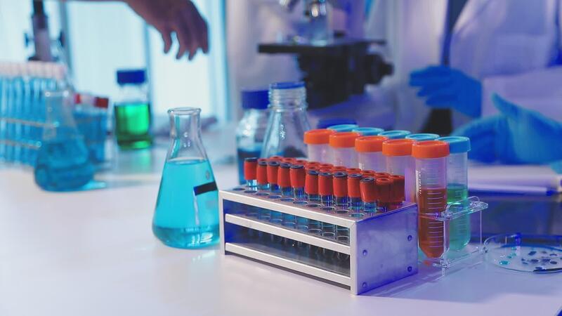 A laboratory with several test tubes and a person in a lab coat Free Video