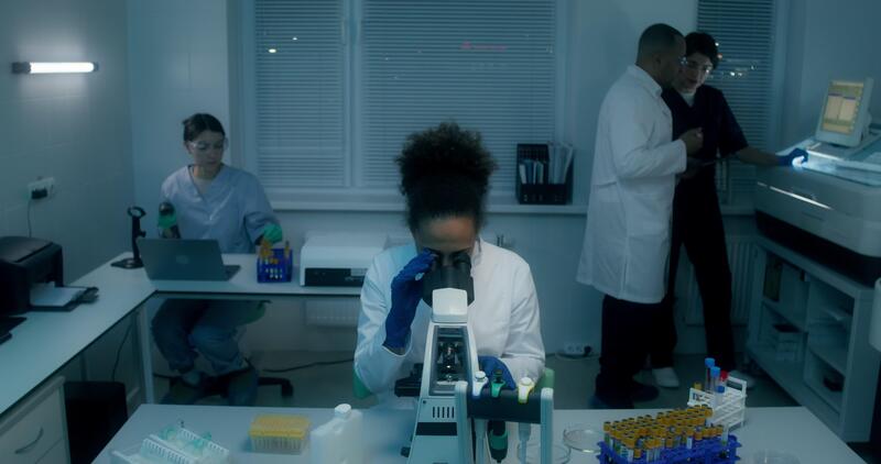 Work in a medical laboratory. A man and a woman approach with a question, showing the tablet to their colleague working with a microscope Pro Video