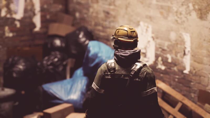 Worker in a dimly lit area with garbage and debris around them Pro Video
