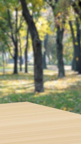 Empty wood table with green tree at park bokeh blur vertical background copy space for display of product Free Video