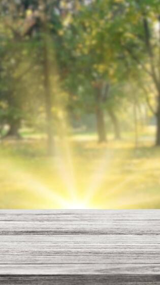 Empty wood table with green tree at park with shiny light bokeh blur vertical background copy space for display of product Free Video