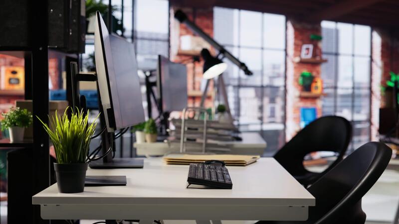 Empty startup office with PC on desk to be used by programmers building scalable solutions for businesses. AI industry startup workspace leveraging machine learning technology Pro Video