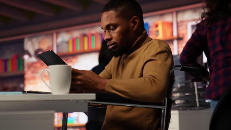 Startup entrepreneur in wheelchair using tablet to do research, looking to grow value of company. Venture business manager with disability using device, developing innovative growth strategy, camera B Pro Video