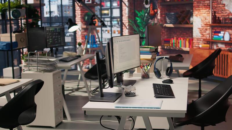 Empty AI tech agency office providing custom software development services. Technology venture workspace using machine learning to streamline coding process in startup office, jib down shot Pro Video