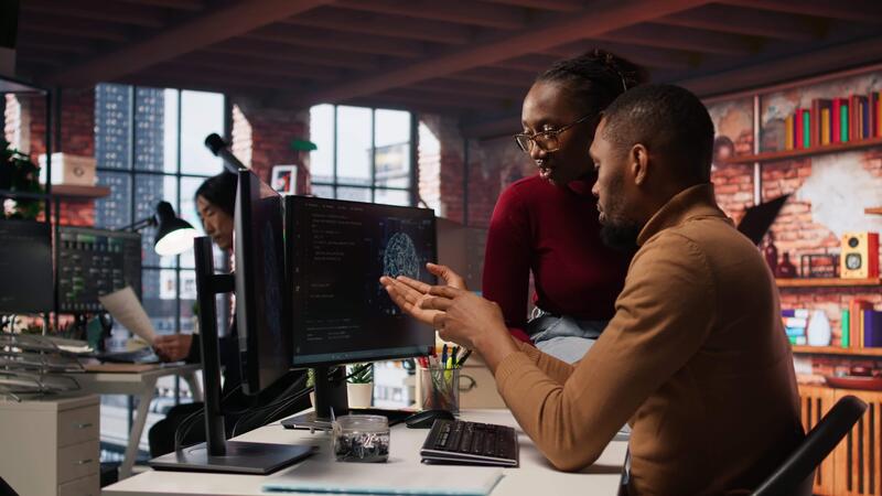 Team of startup admins doing brainstorming, working with machine learning tech advancing AI. Software development agency staff members transforming data into predictive models, camera A Pro Video