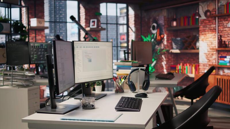 PC in empty IT startup office displaying programming languages used for building applications. Computer screen in software development agency showing code, trucking right shot Pro Video