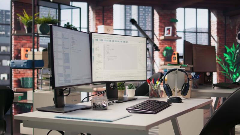 Empty startup office with PC on desk to be used by programmers building scalable solutions for businesses. AI industry startup workspace leveraging machine learning technology Pro Video