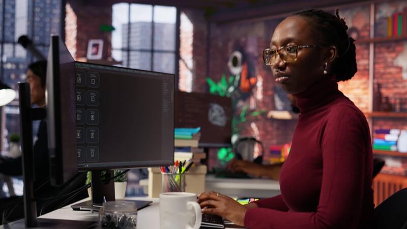 Silicon Valley venture programmer solving tasks with AI LLM chatbot using predictive technology. African american startup IT worker using PC to interact with generative model, camera B Pro Video