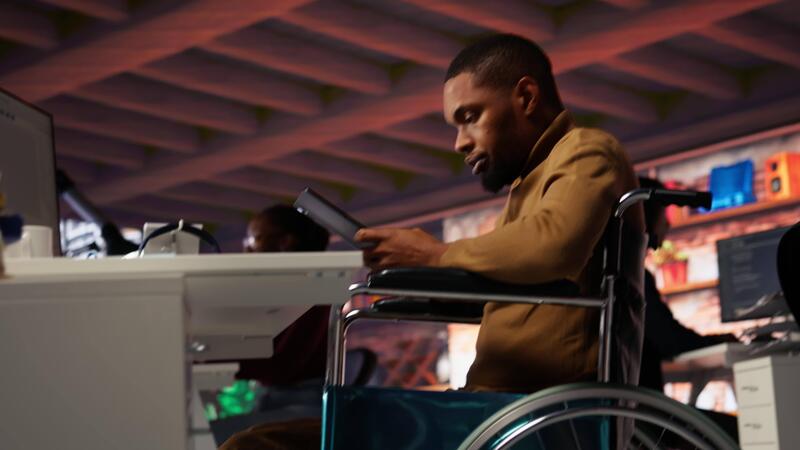 Admin in wheelchair using tablet in innovative startup office to build application. Inclusive software development agency worker with paraplegia checks code on device, camera B Pro Video