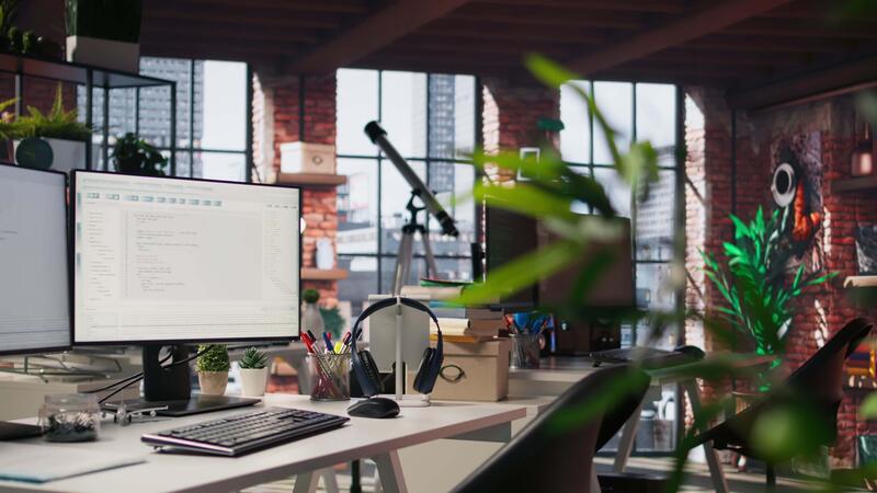Empty AI industry startup workplace leveraging machine learning technology. Company office with PC on desk to be used by programmers building scalable solutions for businesses, trucking left shot Pro Video