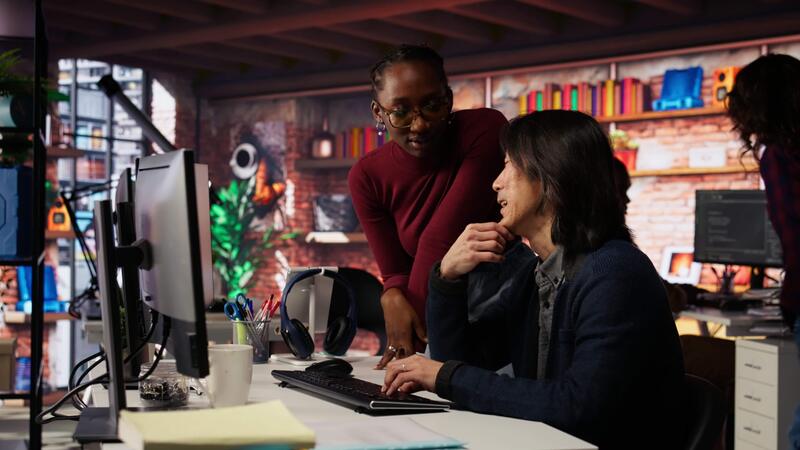 Programmer coming to AI startup office CTO manager desk to request help. Employee asks questions to senior team leader in artificial intelligence software development agency, camera B Pro Video
