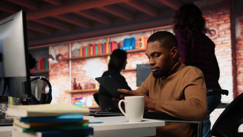 Startup entrepreneur in wheelchair using tablet to do research, looking to grow value of company. Venture business manager with disability using device, developing innovative growth strategy, camera A Pro Video