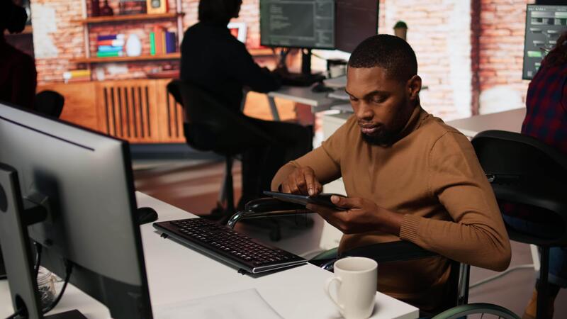 Admin in wheelchair using tablet in innovative startup office to build application. Inclusive software development agency worker with paraplegia checks code on device, camera A Pro Video