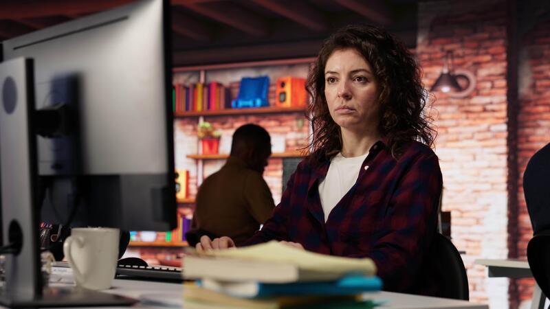 Woman using PC in startup office to design and implementing algorithms enabling machine learning. Technology unicorn venture employee conducts detailed code reviews to fix bugs, camera B Pro Video