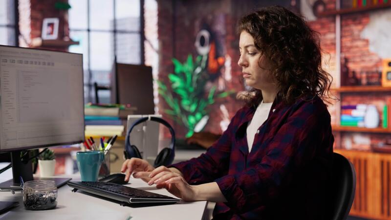 Happy employee using programming languages on PC in IT startup office to build applications. Cheerful IT expert using computer in software development agency to code, camera B Pro Video