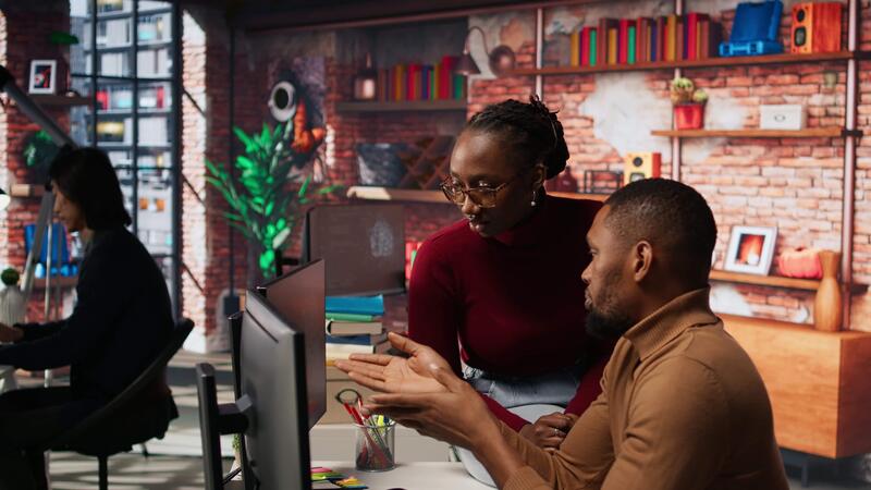 Teamworking programmers creating deep learning models analyzing data in artificial intelligence development agency. African american IT coworkers programming in AI startup office, camera A Pro Video