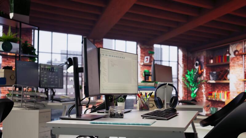 Empty AI tech agency workspace providing custom software development services. Machine learning technology running on PC in startup office to streamline coding process, handheld camera shot Pro Video