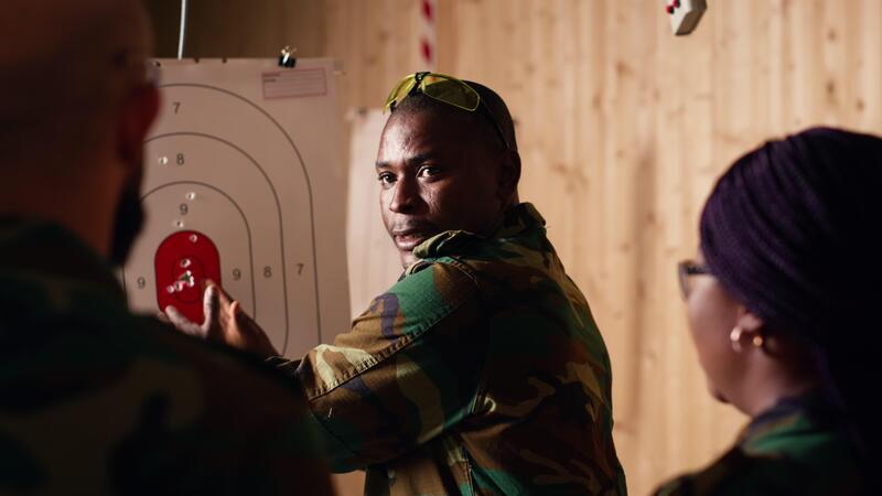 Army commander teaching recruits in shooting gallery how to shoot paper targets, explaining pointing system. Military officer instructing soldiers on how to hit bullseye, reading rules, camera B Pro Video