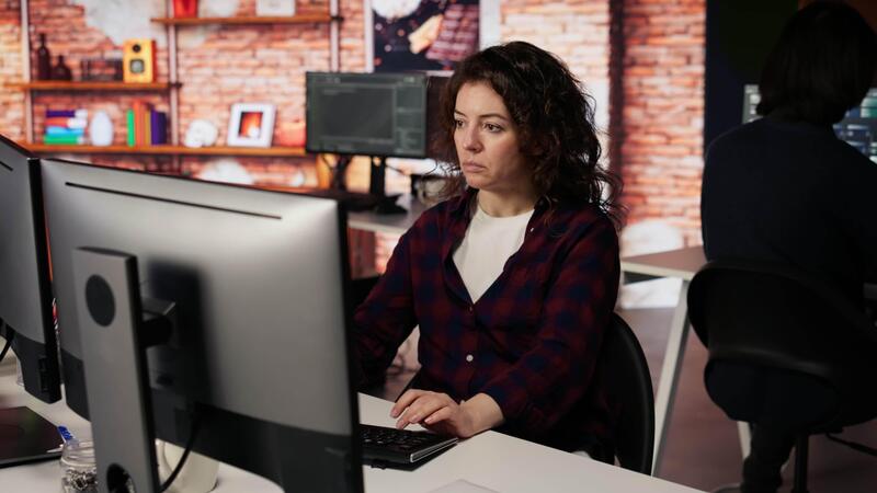 CTO manager overseeing work done by engineer in tech agency providing software development services. Startup office supervisor checking up on IT expert using artificial intelligence, camera B Pro Video