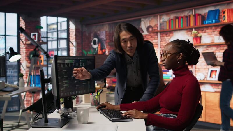Artificial intelligence startup company manager overseeing programmer building application. Asian team leader assisting worker in AI software development agency, offering advice, camera A Pro Video