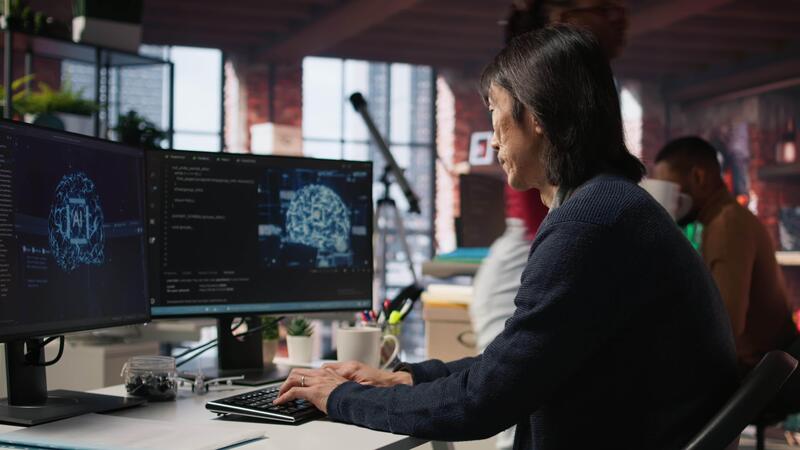 Software engineer in small business workspace using computer to oversee artificial intelligence neural networks. Person in tech startup office using AI machine learning systems on PC, camera A Pro Video