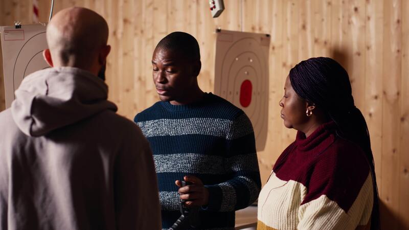 Shooting gallery safety officer explaining bullseye scoring system and reading rules. Firing range expert teaching bullseye points system and discussing industry regulations, camera B Pro Video