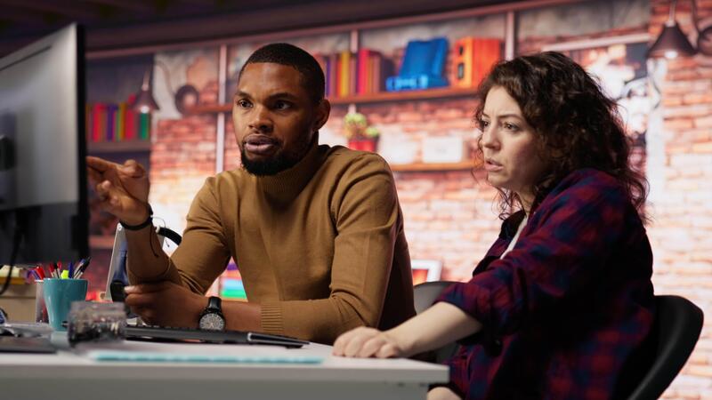 IT employees in startup office working at computer desks, testing and deploying programs and systems. Programmer and developer checking code on desktop PCs, solving tasks in workspace, camera B Pro Video