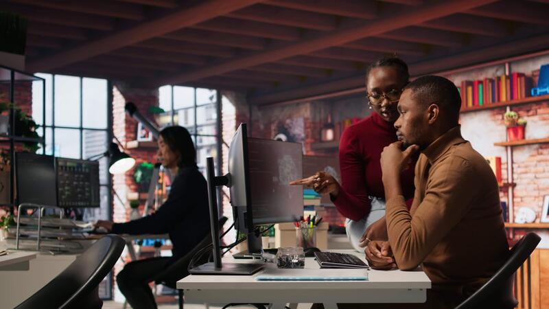 Team of technicians create machine learning models analyzing data in artificial intelligence development agency. IT worker and colleague program in AI startup office to build applications, camera A Pro Video