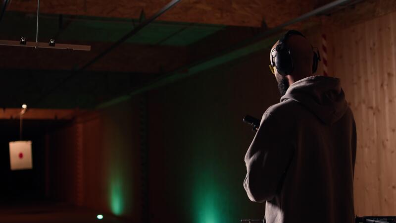 Person wearing protecting gear loading magazine in pistol during firearm practice session at shooting range. Gun enthusiast reloading handgun, learning self defense, pointing weapon, camera A Pro Video