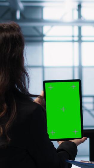 Vertical Engineers using green screen tablet in data center, checking infrastructure reliability, writing in clipboard. Workers using mockup device in server room, managing server virtualization, camera A Pro Video
