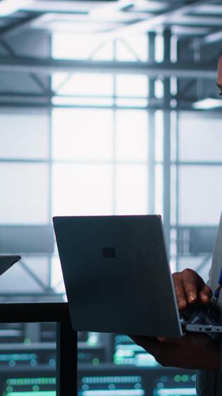 Vertical System administrators using notebook device in data center, managing server virtualization. IT specialists using laptop in server farm, sustaining long term infrastructure reliability, camera A Pro Video