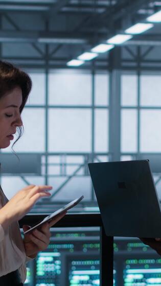 Vertical Developers in data center using laptop and tablet, executing security patches, securing firewall. Server farm workers using devices to perform vulnerability scans, ensuring data protection, camera A Pro Video