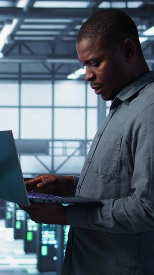 Vertical Portrait of happy system administrators in data center using devices, verifying firewall configurations. Jolly teamworking IT experts performing equipment vulnerability scans in server hub, camera B Pro Video