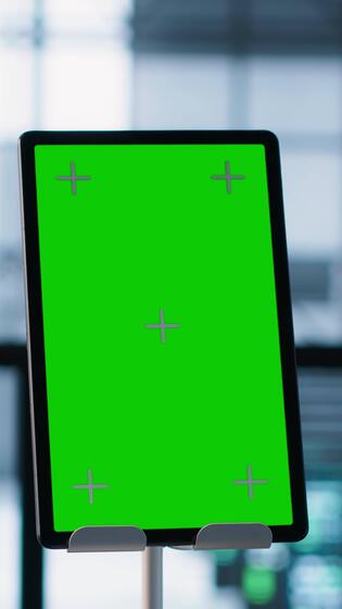 Vertical Isolated screen mockup tablet in front of technicians in blurry background working in server farm, analyzing data. Close up of chroma key tablet next to coworkers examining data center, camera A Pro Video