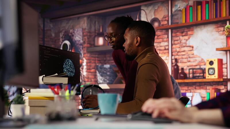 Startup staff members gathered together to conduct code review to fix bugs, identifying technical issues. Artificial intelligence company coworkers doing brainstorming, optimizing code, camera B Pro Video