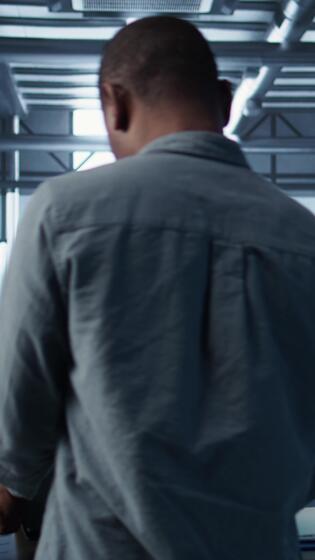 Vertical Computer scientist in server room coding on laptop, developing disaster recovery plans. African american man in data center testing failover scenarios using notebook, camera B Pro Video