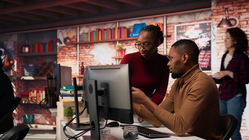 Coworkers looking at PC screen in startup office, managing cloud computing resources and platforms to train machine learning models. Teamworking colleagues monitoring venture company systems, camera A Pro Video