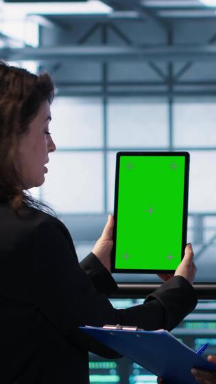 Vertical Computer scientists in data center use mockup tablet, inspecting server rigs, updating devices. Teamworking IT colleagues collaborating to ensure stable operations, using chroma key device, camera A Pro Video