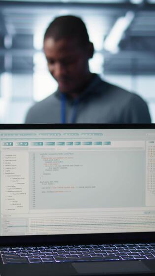 Vertical Lines of code on laptop display used by teamworking data center colleagues to run security patches. Programming language on notebook used by server room IT experts scanning gear, camera B close up Pro Video