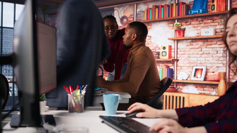 Team of startup workers conducting code review on PC to fix bugs, identifying technical issues with artificial intelligence company software. IT staff members optimizing code using device, camera A Pro Video