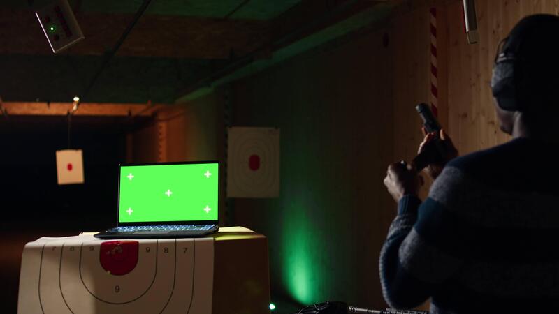 Green screen laptop next to man in firing range pressing mechanism to recall paper targets. Mockup notebook and person training with handguns on bullseye, sharpening skills, camera A Pro Video