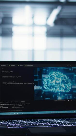 Vertical Focus on laptop used by teamworking data center computer scientists in background using artificial intelligence. Notebook screen with neural networks doing computing processes, camera B close up Pro Video
